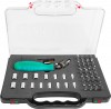 Набор предназначен для работы с резьбовыми соединениями и состоит из гибкой отверточной рукоятки с храповым механизмом и наборами бит и торцевых головок.